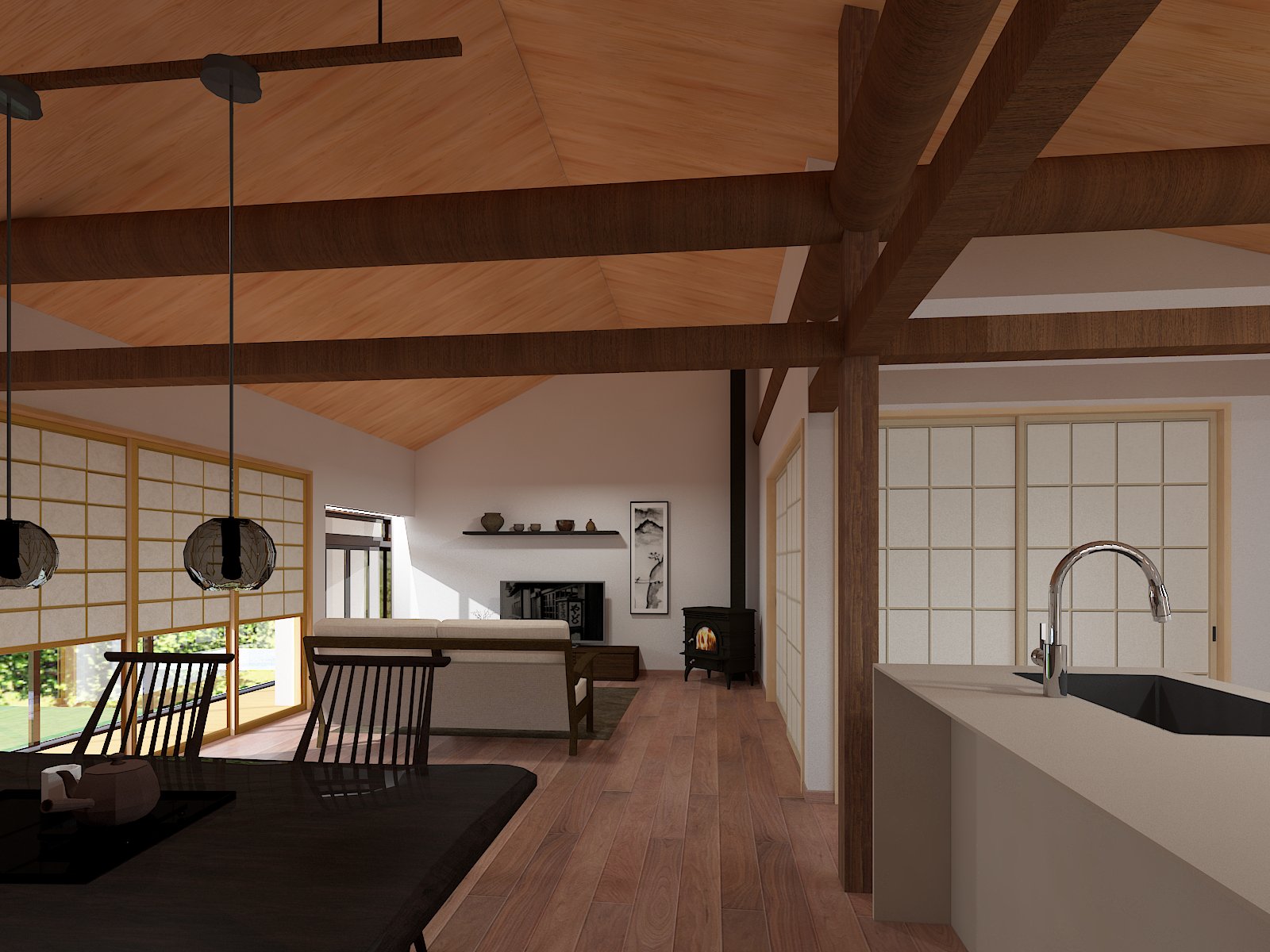 黒く太い柱が支える重厚な構造。