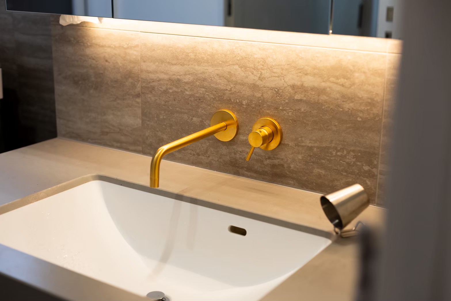 壁一面にタイルを施工し、真鍮の水栓を採用。落ち着きのある上質な洗面室に仕上げました。