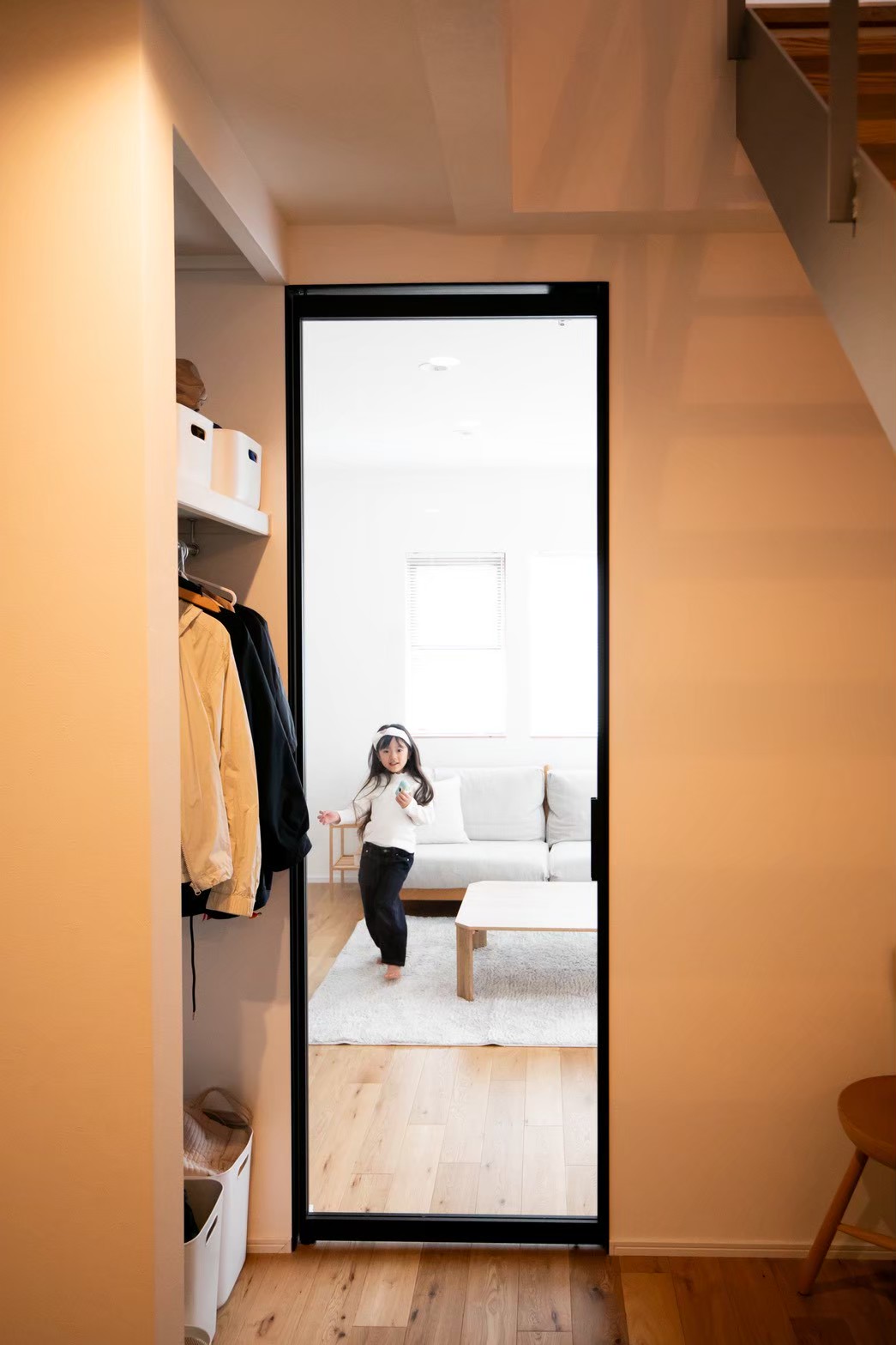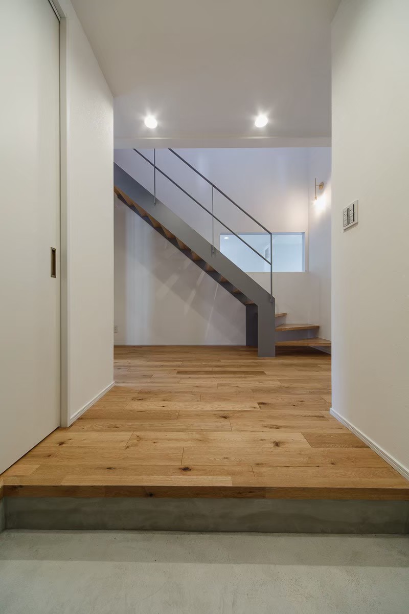 既存階段を撤去し、鉄骨スケルトン階段を採用。さらにFIXガラスを設け、光が差し込む明るい玄関になりました。