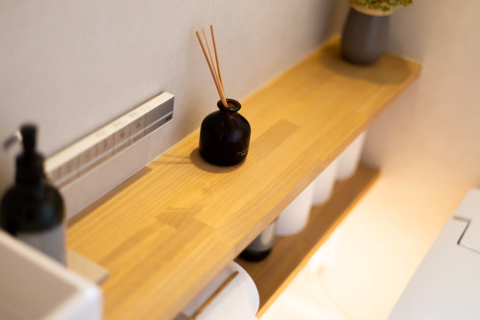 テレビ配線を壁内に収納し、プッシュ式タイルでメンテナンスも可能にしています。